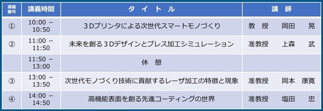 本講座では、近未来を創造する新しいモノづくりテクノロジー(3Dプリンタ技術、加工シミュレーション、レーザプロセッシング、高機能表面コーティング)について、わかりやすく解説します。みなさまのご参加をお待ちしています。