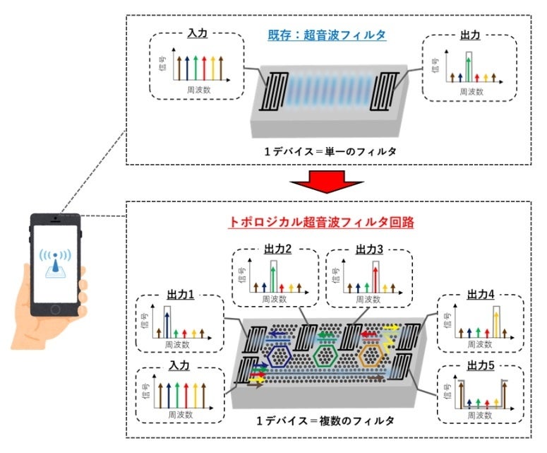 図1. 既存の超音波フィルタ(上)とトポロジカル超音波フィルタ回路(下)の模式図。既存の超音波フィルタでは1デバイスにつき単一のフィルタ機能を持ちます。一方で、トポロジカル超音波フィルタ回路では、微細な回路構造を用いて多数のフィルタを微小基板上に集積できるため、1デバイスにつき複数のフィルタ機能を実現可能になります。