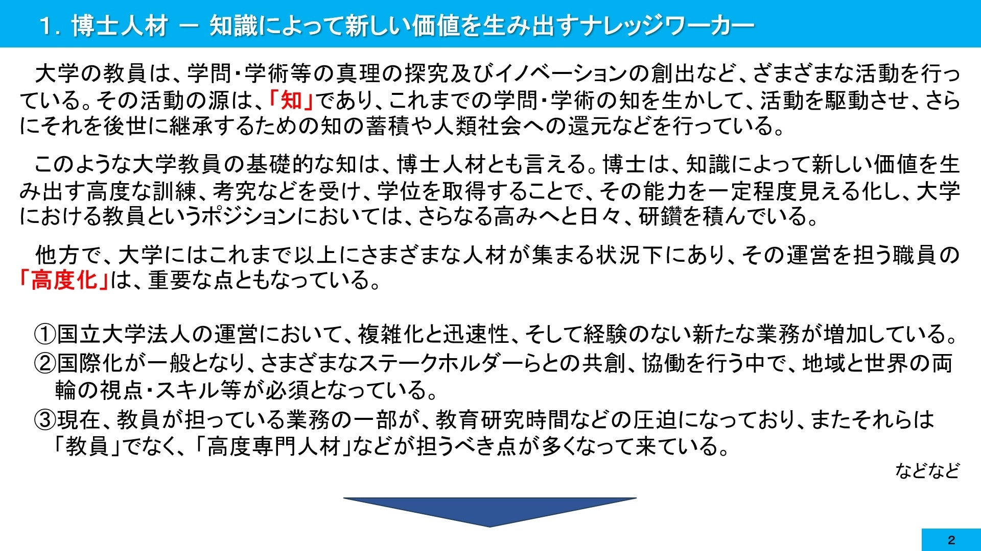 わが国における国立大学法人が置かれている環境は日々劇的に変化しており、従来(法人化前)と比べて業務が複雑化し、迅速性が求められ、そして高等教育機関である大学における教育研究活動の枠を超えた経験のない新たな業務等が増加しています。さらに現在、教員が担っている業務の一部が、教育研究時間の圧迫などにもなっており、またそれらは「教員」ではなく「高度専門人材」などが担うべき点も多くなってきています。