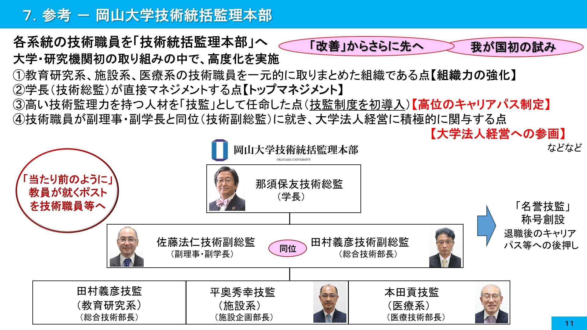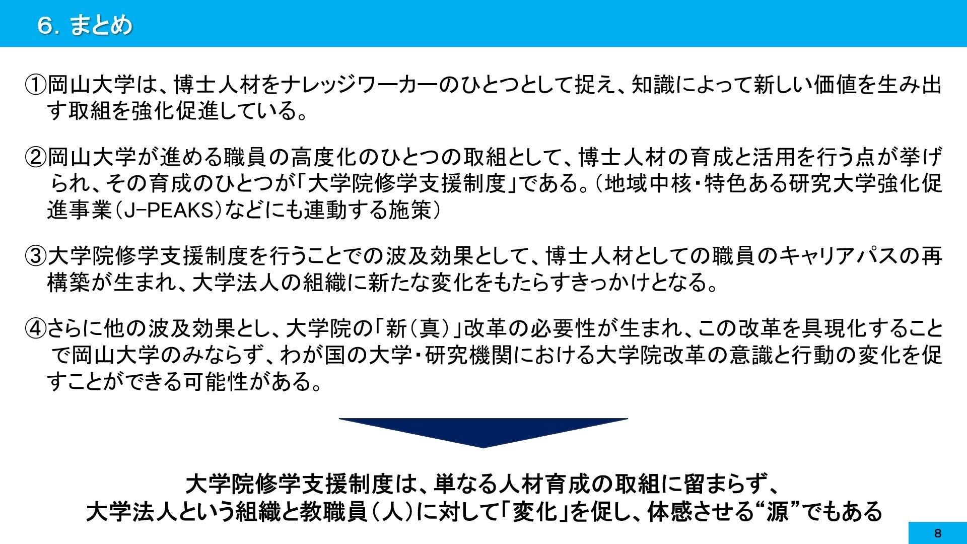 つまり、本制度を運用することで大学職員の高度化のみならず、博士人材としての職員のキャリアパスの再構築が生まれ、大学法人の組織に新たな変化をもたらすこと、さらに大学院の『新(真)』改革の必要性が生まれ、この改革を具現化することで岡山大学のみならず、わが国の大学・研究機関における大学院改革の意識と行動の変化を促すことができる可能性があると考えます。