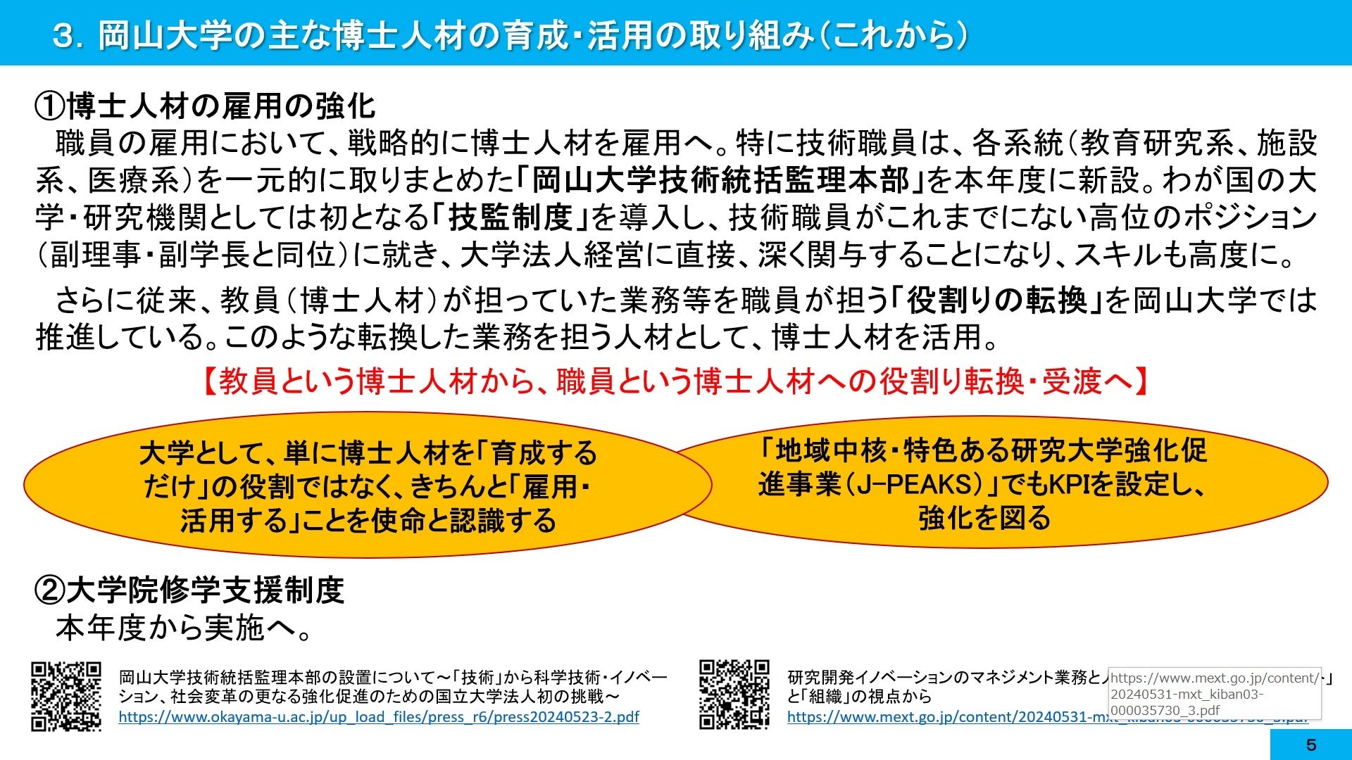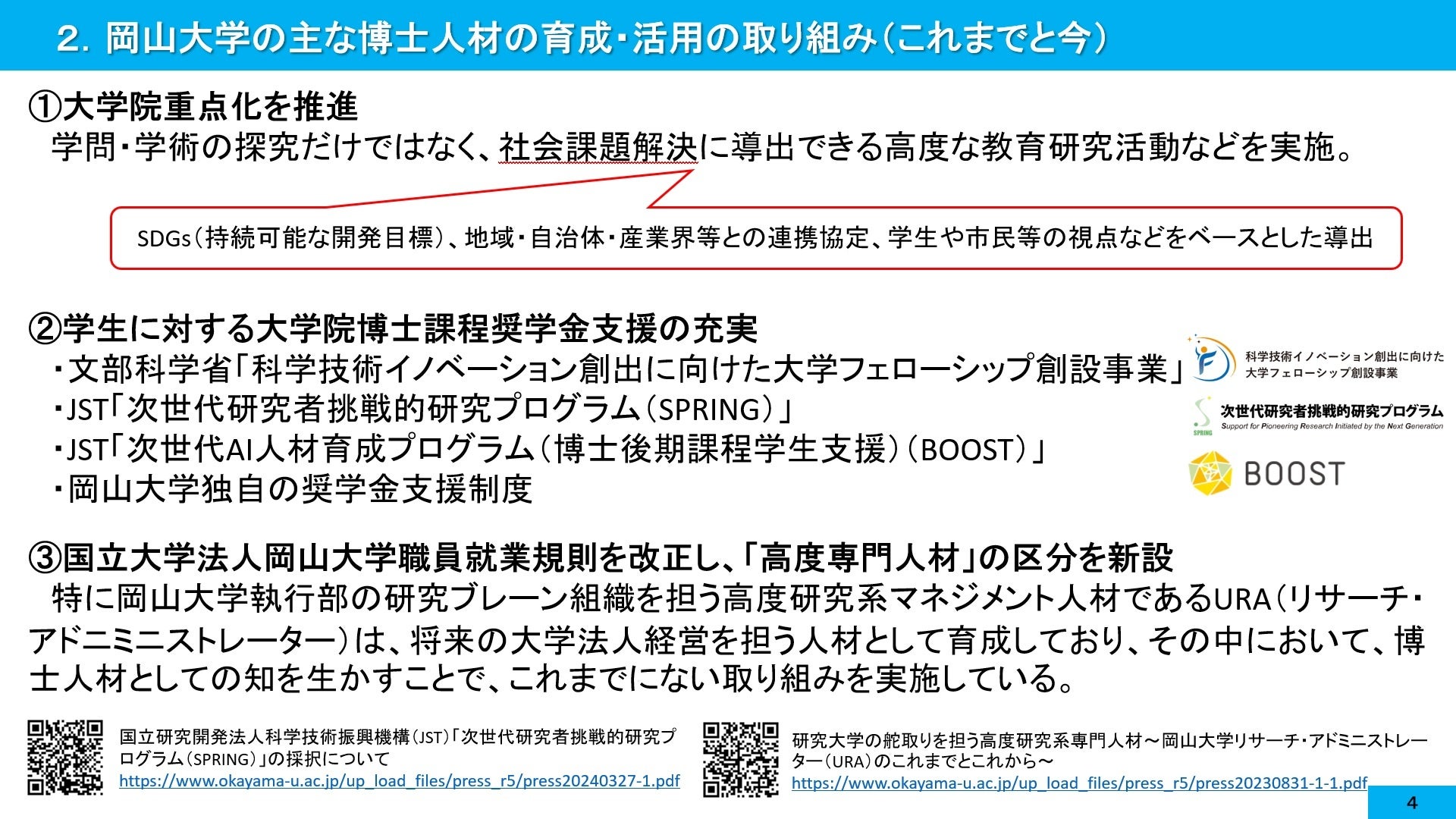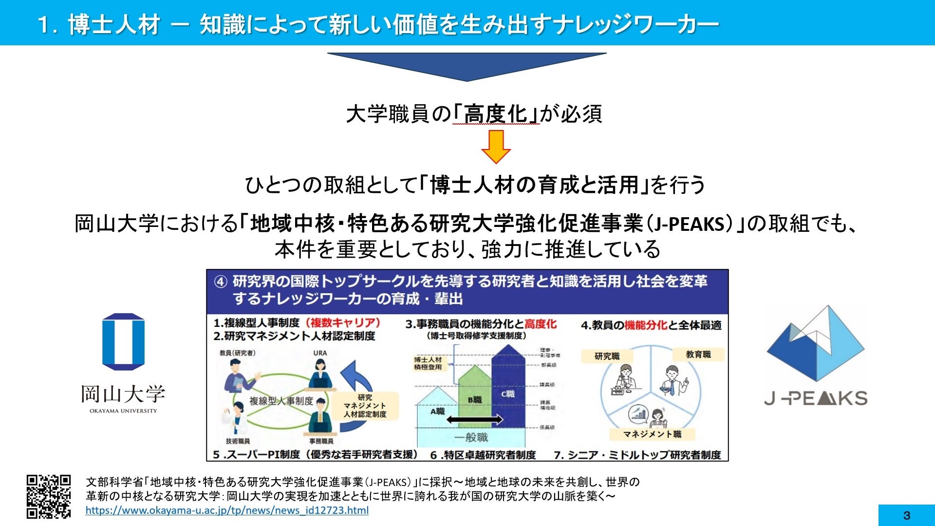 岡山大学では、ナレッジワーカーとしての博士人材の育成として、学生を対象に、文部科学省「科学技術イノベーション創出に向けた大学フェローシップ創設事業」やJST「次世代研究者挑戦的研究プログラム(SPRING)」、「次世代AI人材育成プログラム(博士後期課程学生支援)(BOOST)」、そして本学独自の奨学金支援制度など、多種多様な支援制度を運用しています。また本年度から「国立大学法人岡山大学職員就業規則」を改正し、「高度専門人材」の区分を新設。博士人材運用等を含めた制度改革を既に実施しています。