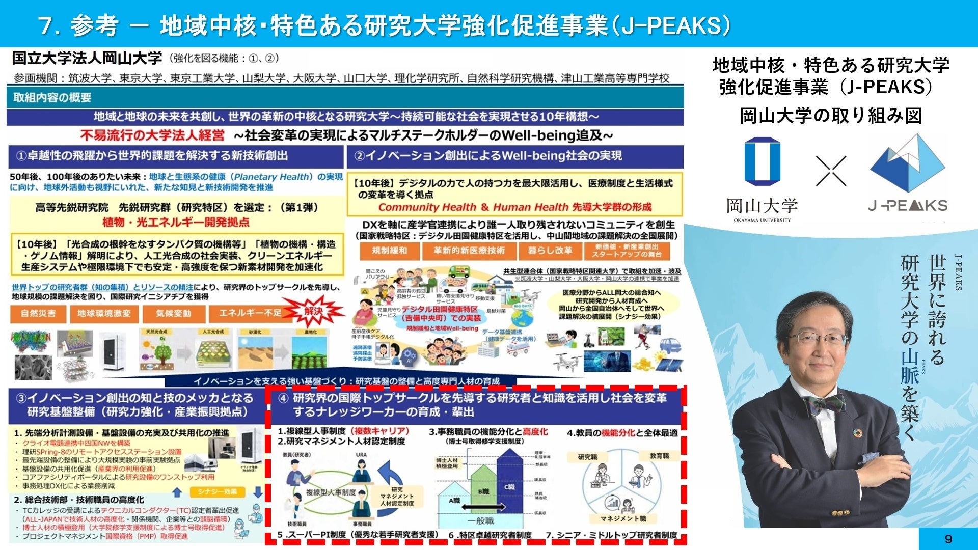 岡山大学 文部科学省「地域中核・特色ある研究大学強化促進事業(J-PEAKS)」に採択~地域と地球の未来を共創し、世界の革新の中核となる研究大学:岡山大学の実現を加速とともに世界に誇れる我が国の研究大学の山脈を築く~