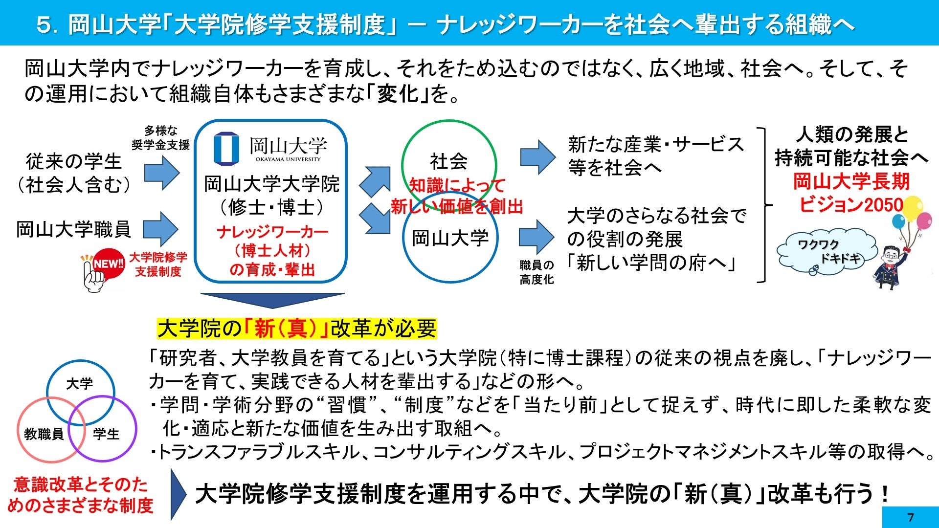さらに従来の大学院での教育研究の在り方も本制度などをもとに変えていくことになると考えています。大学院は研究者や大学教員だけを育成する場ではもはやありません。知識から新しい価値を生み出す人材を生み出す場として、しっかりと体を成すように、今後もさまざまな組織・制度改革などを、戦略的かつスピード感を持って実施します。どうぞ地域中核・特色ある研究大学である岡山大学の挑戦にご期待ください。