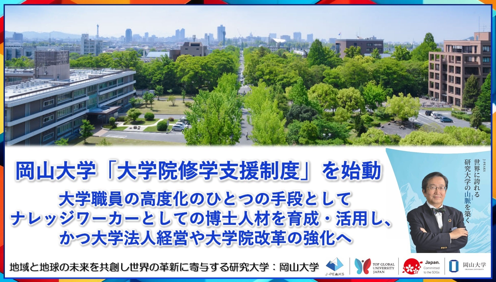 国立大学法人岡山大学(本部:岡山市北区、学長:那須保友)は今回、この大学職員の高度化を成すためのひとつの手段として、ナレッジワーカーとしての博士人材の育成・活用を行い、その仕組みとして大学院修学支援制度を本年度秋学期から開始します。