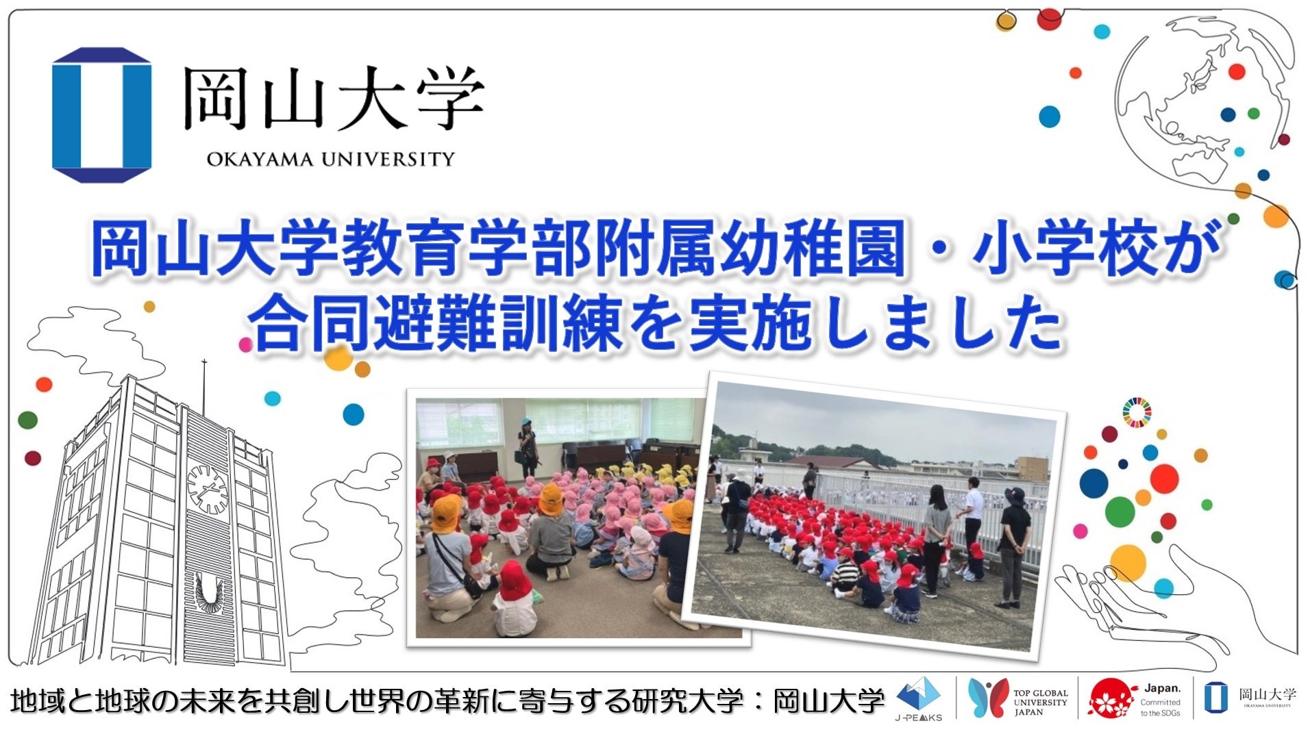 国立大学法人岡山大学(本部:岡山市北区、学長:那須保友)は、梅雨の晴れ間の2024年7月3日に、岡山大学教育学部附属幼稚園・小学校の合同避難訓練を行いました。
