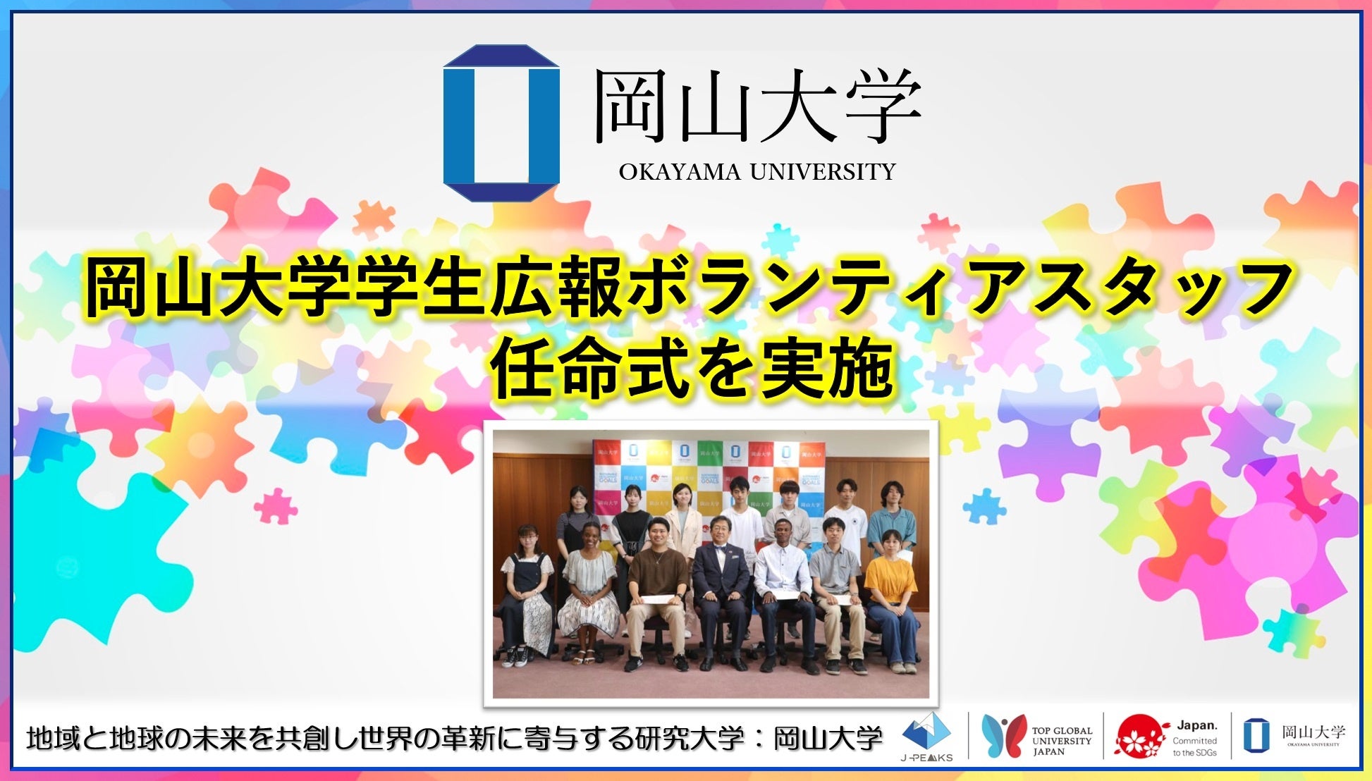 国立大学法人岡山大学(本部:岡山市北区、学長:那須保友)は、2024年7月18日、学生広報ボランティアスタッフ任命式を本学津島キャンパスの本部棟で行いました。