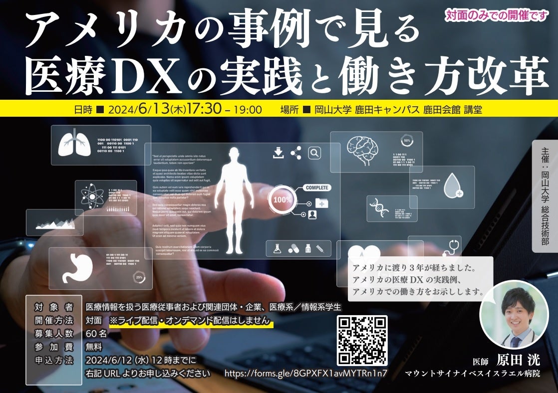 国立大学法人岡山大学(本部:岡山市北区、学長:那須保友)技術統括監理本部を構成する組織のひとつである総合技術部は2024年6月13日、医療DXを目的とする講演会「アメリカの事例で見る医療DXの実践と働き方改革」を本学鹿田キャンパスの鹿田会館講堂で開催しました。