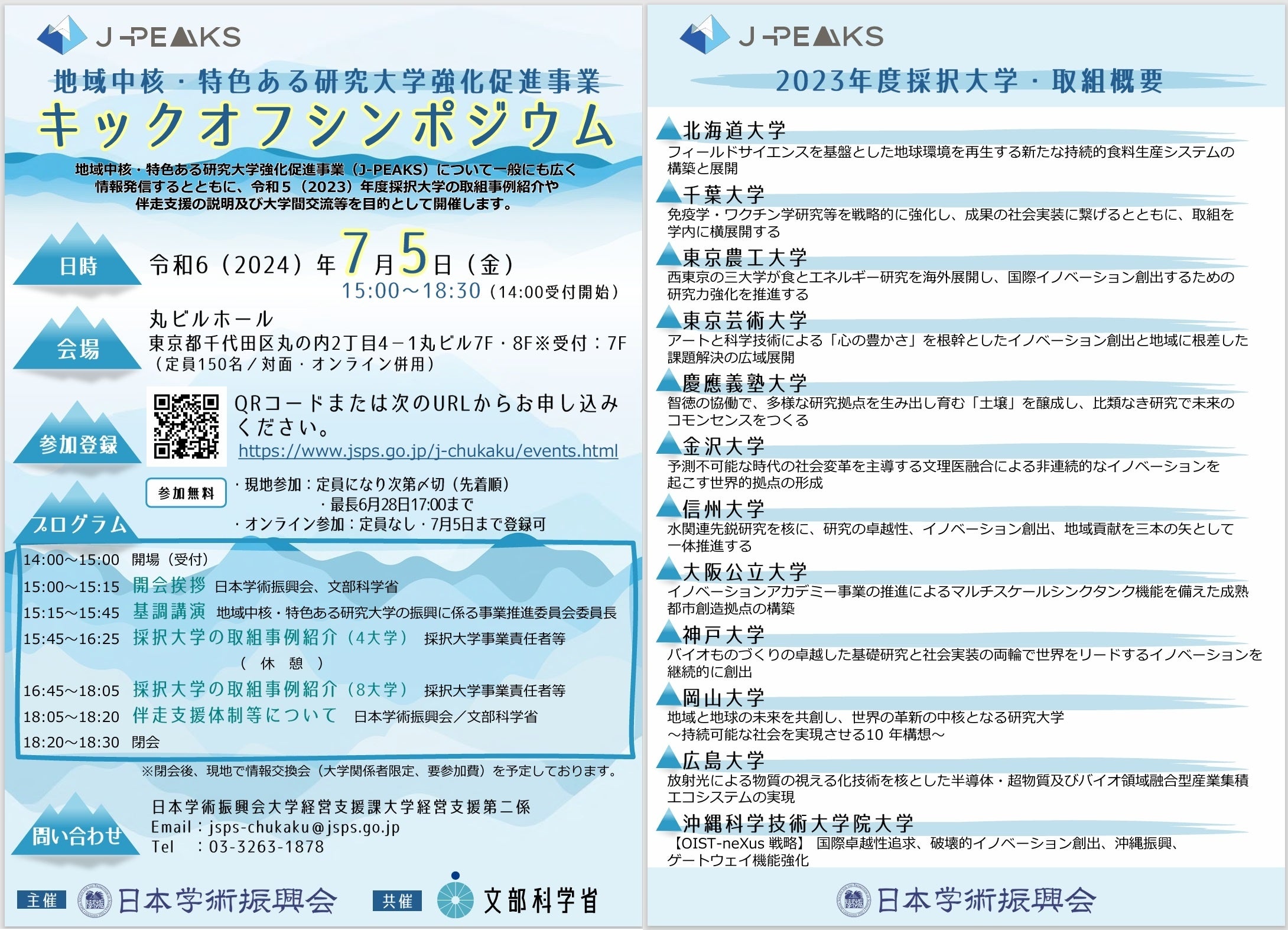 ・日本学術振興会(JSPS)主催・文部科学省共催の「地域中核・特色ある研究大学強化促進事業(J-PEAKS)キックオフシンポジウム」(独立行政法人日本学術振興会)