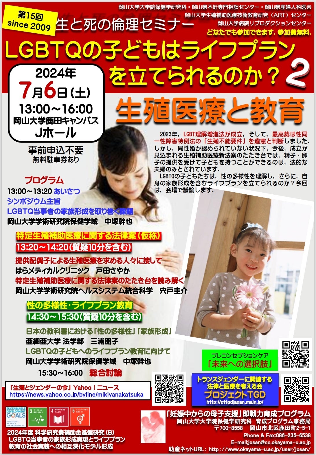 国立大学法人岡山大学(本部:岡山市北区、学長:那須保友)では、2024年7月6日(土)13:00~16:00に公開セミナー「LGBTQの子どもはライフプランを立てられるのか? 2 生殖医療と教育」を、本学鹿田キャンパスのJunko Fukutake Hall(Jホール)で開催します。