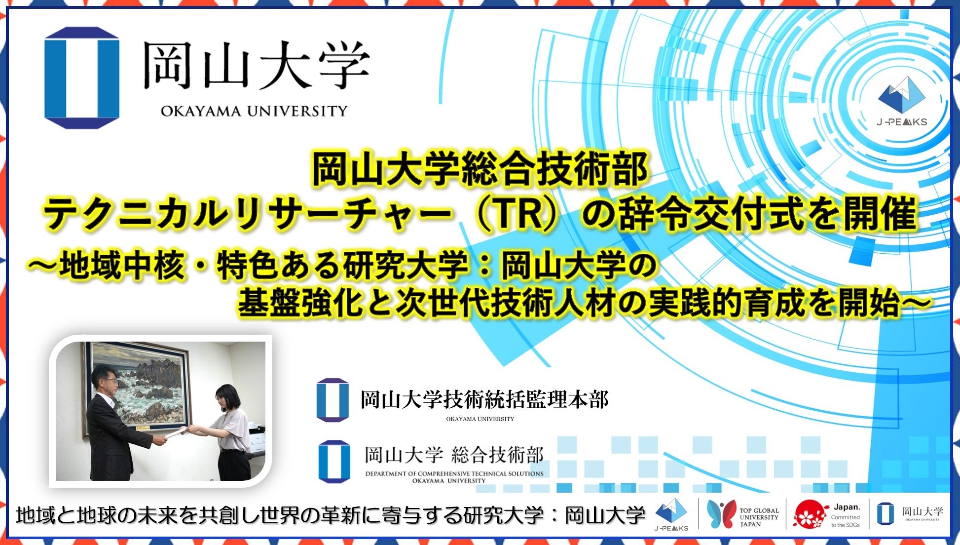 国立大学法人岡山大学(本部:岡山市北区、学長:那須保友)技術統括監理本部を構成する組織のひとつである総合技術部は2024年6月17日、本学津島キャンパスの環境理工棟会議室において、テクニカルリサーチャー(TR)の辞令交付式を開催しました。