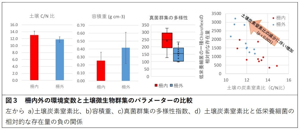 土壌微生物相については、環境DNA分析を通じて比較し、柵内の土壌は真菌類など一部の微生物群の多様性が高い状態にあることが判明しました。